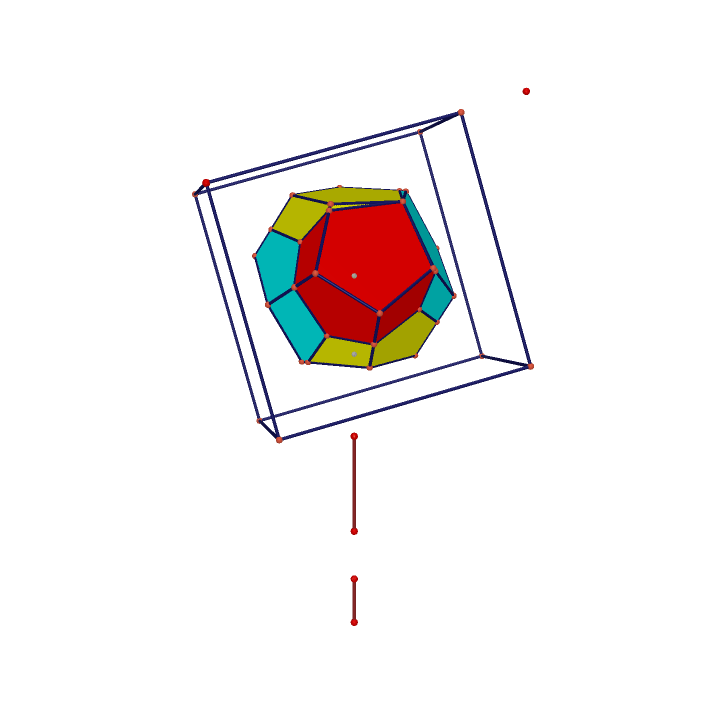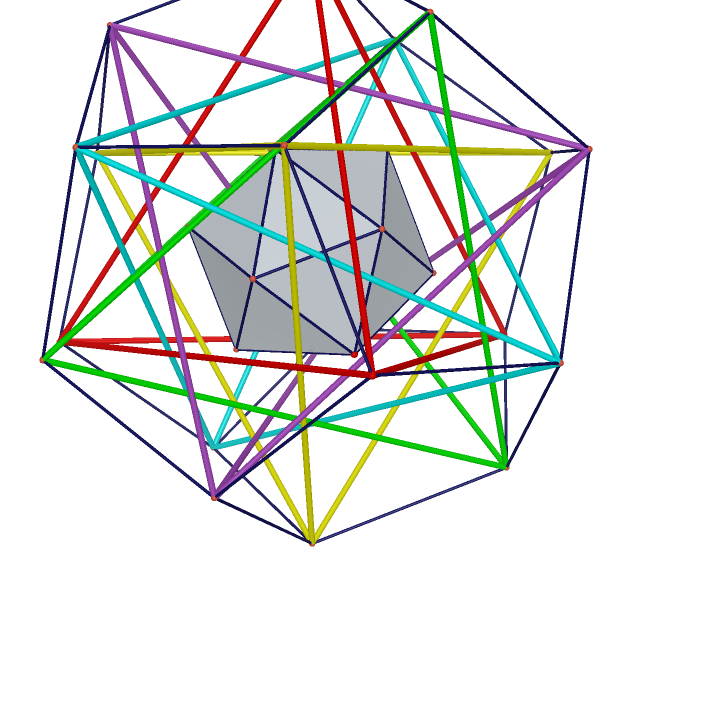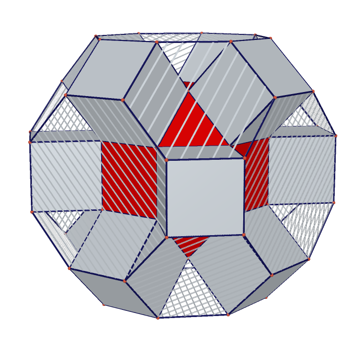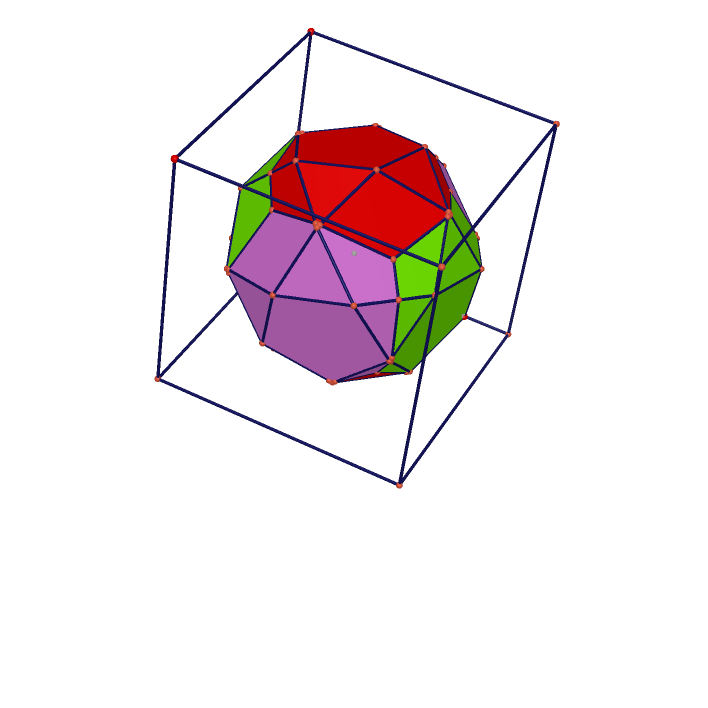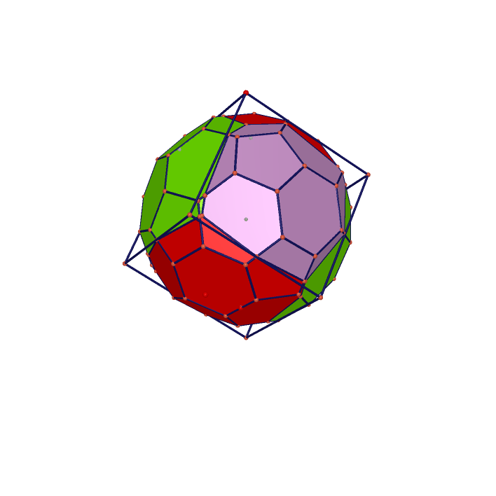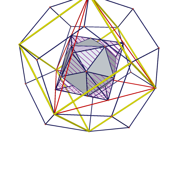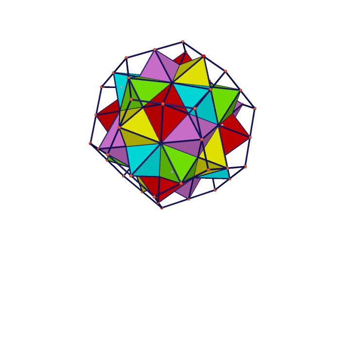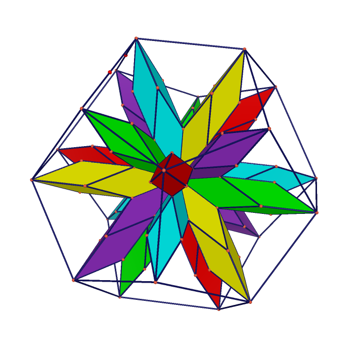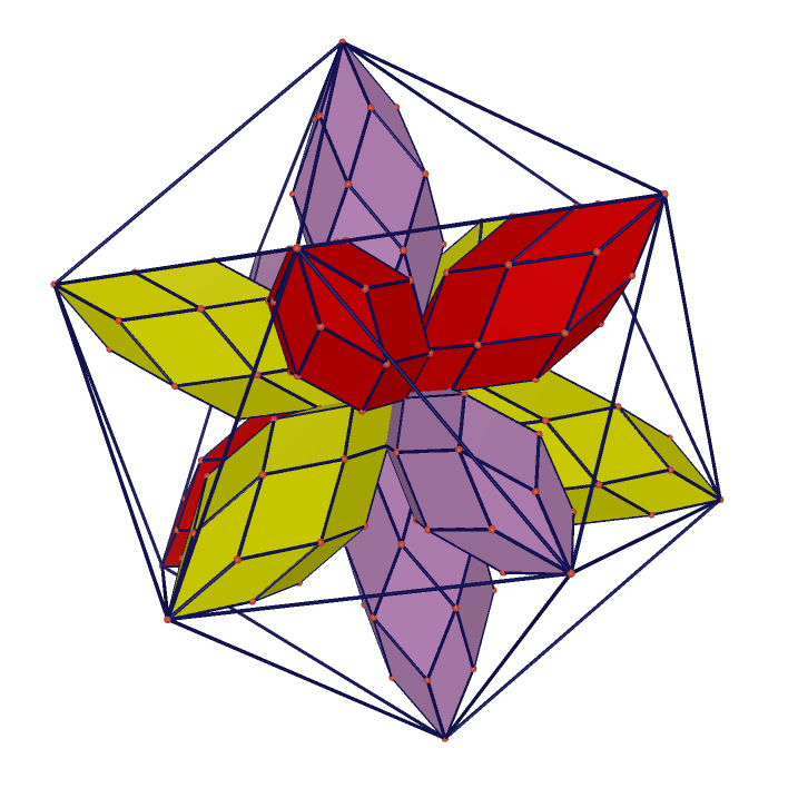 正十二面體內五個正方體交錯,交集為菱形三十面體
