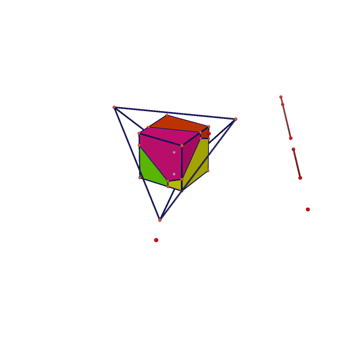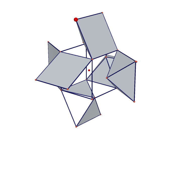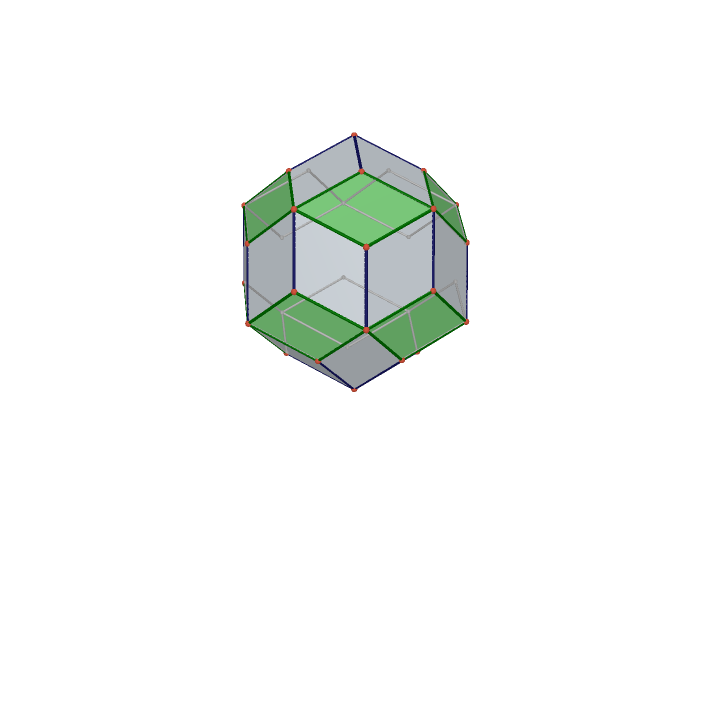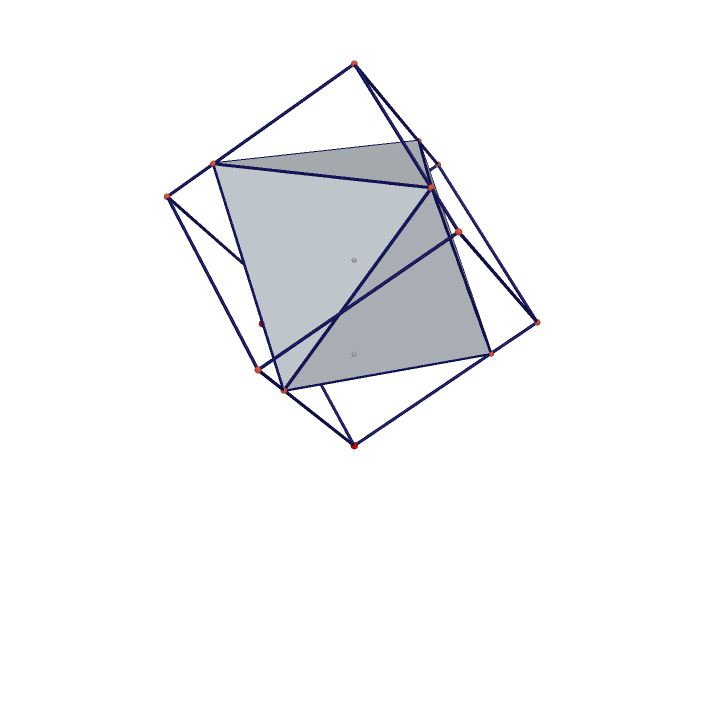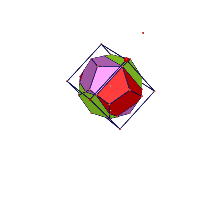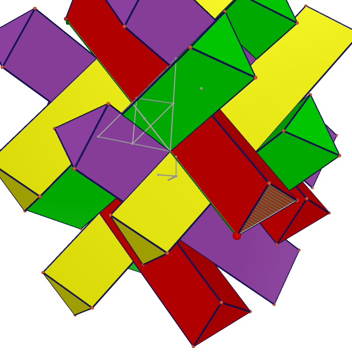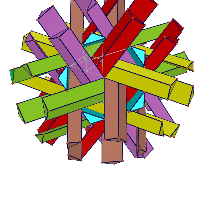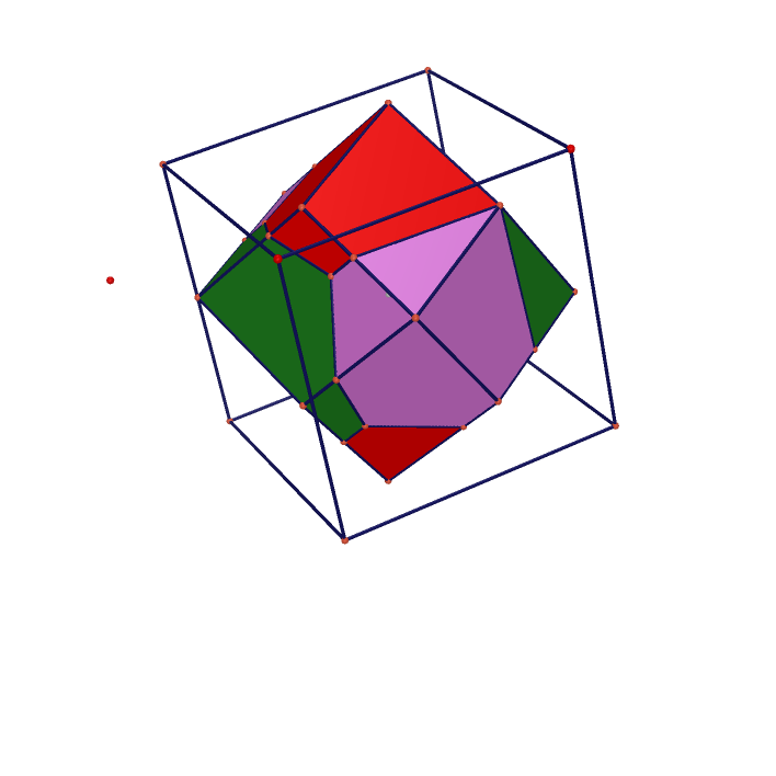 正十二面體內五個正方體交錯,交集為菱形三十面體