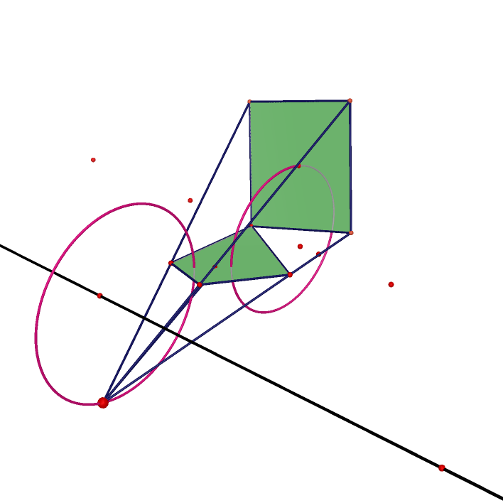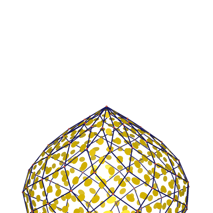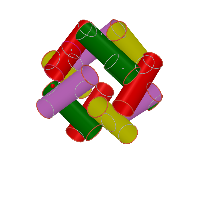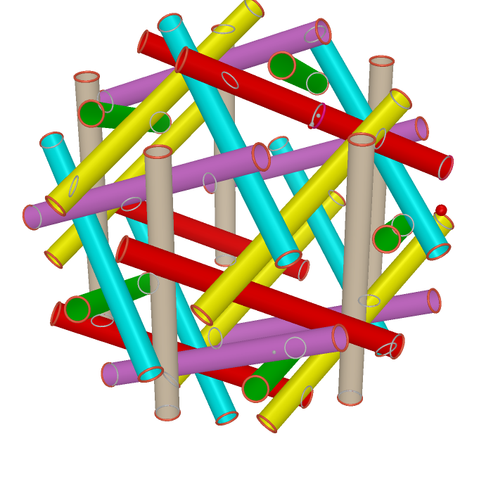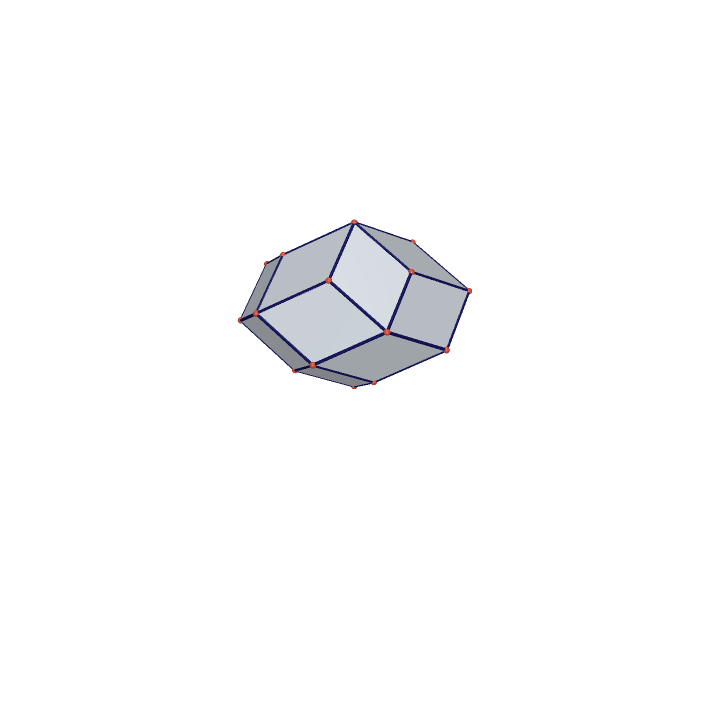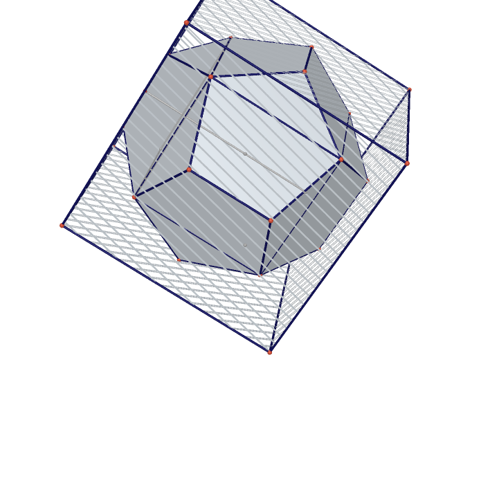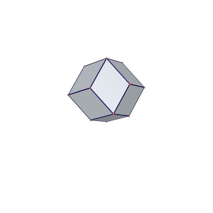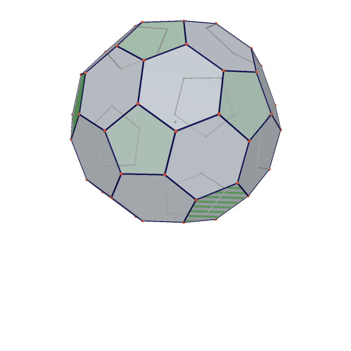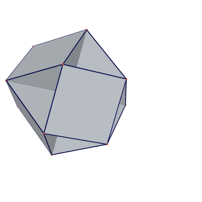 正十二面體內五個正方體交錯,交集為菱形三十面體